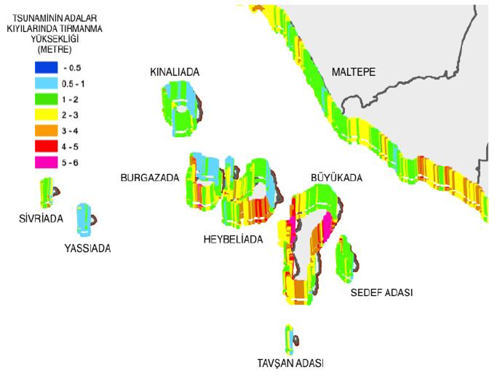 İstanbul Büyükşehir Belediyesi Deprem ve Zemin İnceleme Müdürlüğü ve Japonya ortaklığıyla “İstanbul Kıyılarını Etkileyebilecek Tsunamiler için Benzetim ve Hasar Görebilirlik Analizi” projesi yapılmıştır. Projeden elde edilen bulgulara göre, Marmara Denizi tabanında oluşacak büyük bir depremin İstanbul kıyılarında oluşabilecek en büyük dalga tırmanma yüksekliği ortalama 5 m, tsunami dalgasının kıyılara erişme zamanı 5-10 dakika, kıyılarda tırmanma (baskın) mesafesi 150 metreye kadardır (Görsel 5) Depremin adalarımıza yakınlığı düşünülürse ilk ve en yüksek tsunami dalgaları Yassıada ve Sivriada’ya daha kısa sürede ulaşacaktır. Adaların kuzeye bakan kıyılarında tsunami tırmanma yükseklikleri daha düşük olacaktır. Adalarda yerleşim alanlarının büyük çoğunluğunun kuzey kesimlerini oluşturduğu göz önüne alındığında tsunaminin yerleşim alanlarındaki yıkıcı etkinin azalacağı düşünülmektedir (Görsel 6). Tsunaminin İstanbul ve Adalar kıyılarında etki edeceği bölgeler; sığ deniz alanları, liman ve tekne barınakları, ırmak ve dere ağızları, denizden yüksekliğe göre değişmek üzere kıyıdan 100-150 metre uzaktaki kara alanlarıdır. Tsunami oluşması durumunda, Marmara denizinde etkili olma süresi 90-120 dakika olacaktır. (Eyidoğan, 2017; 4).